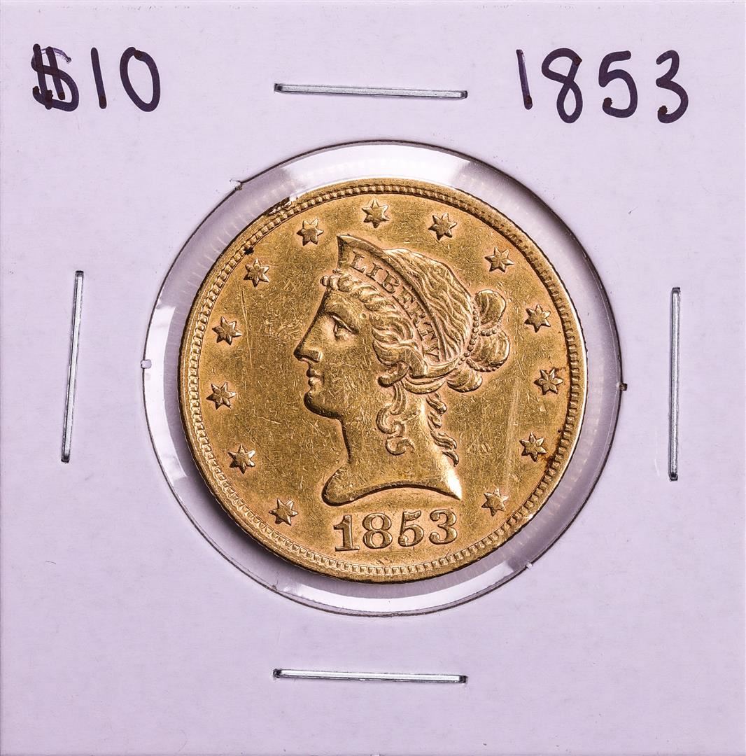 One 1853 $10 Liberty Head Eagle Gold Coin.