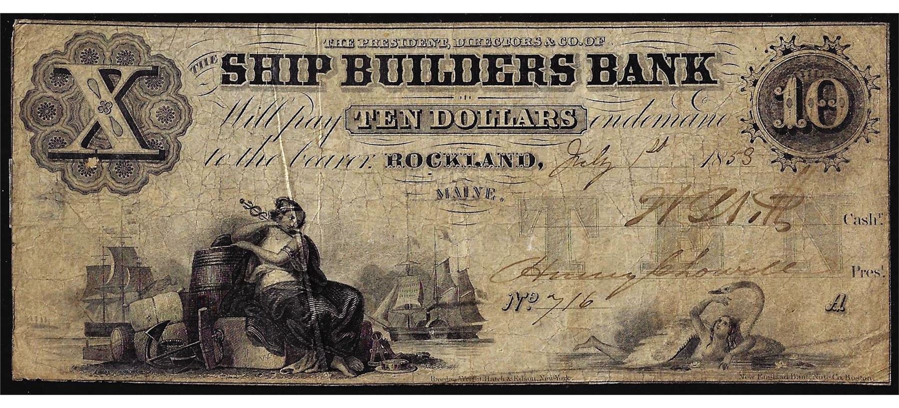 1853 $10 The Ship Builders Bank Rockland, ME Obsolete Banknote