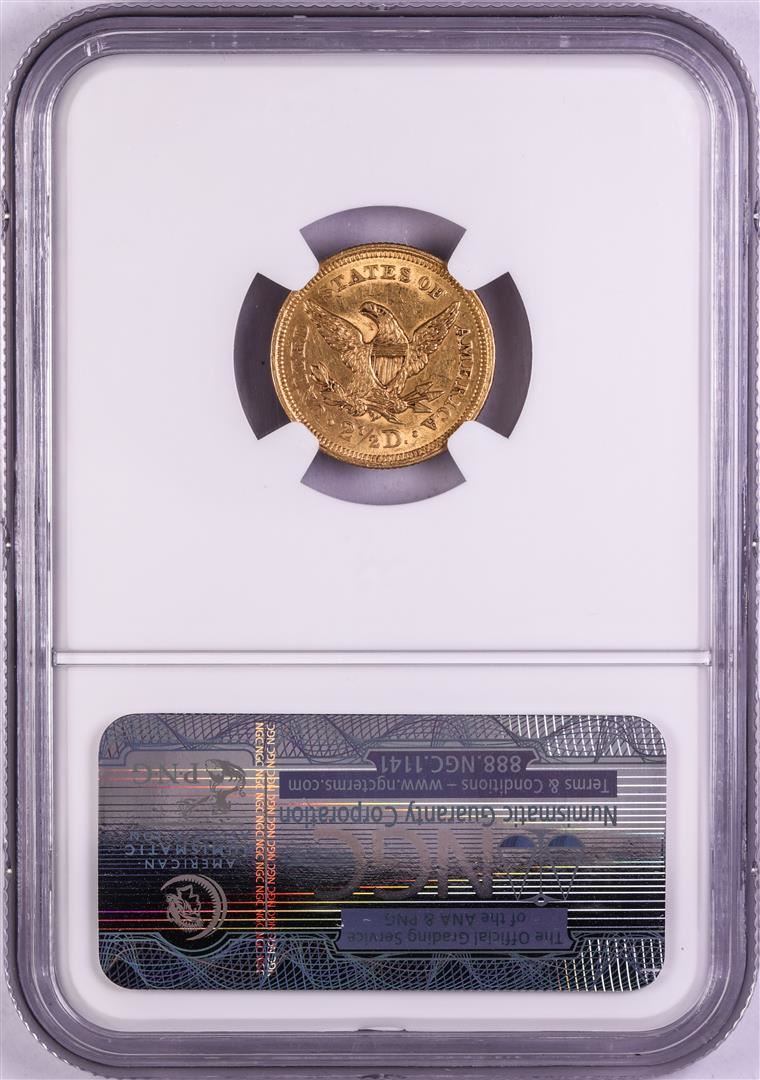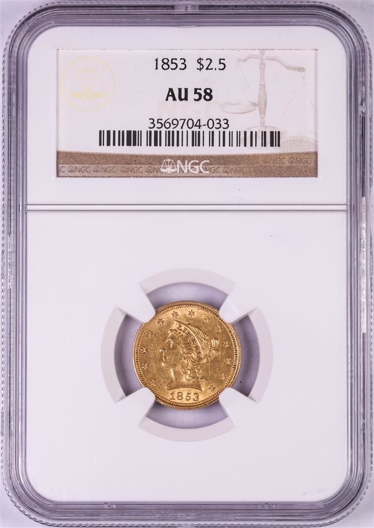 One 1853 $2 1/2 Liberty Head Quarter Eagle Gold Coin NGC AU58. NGC Certified.