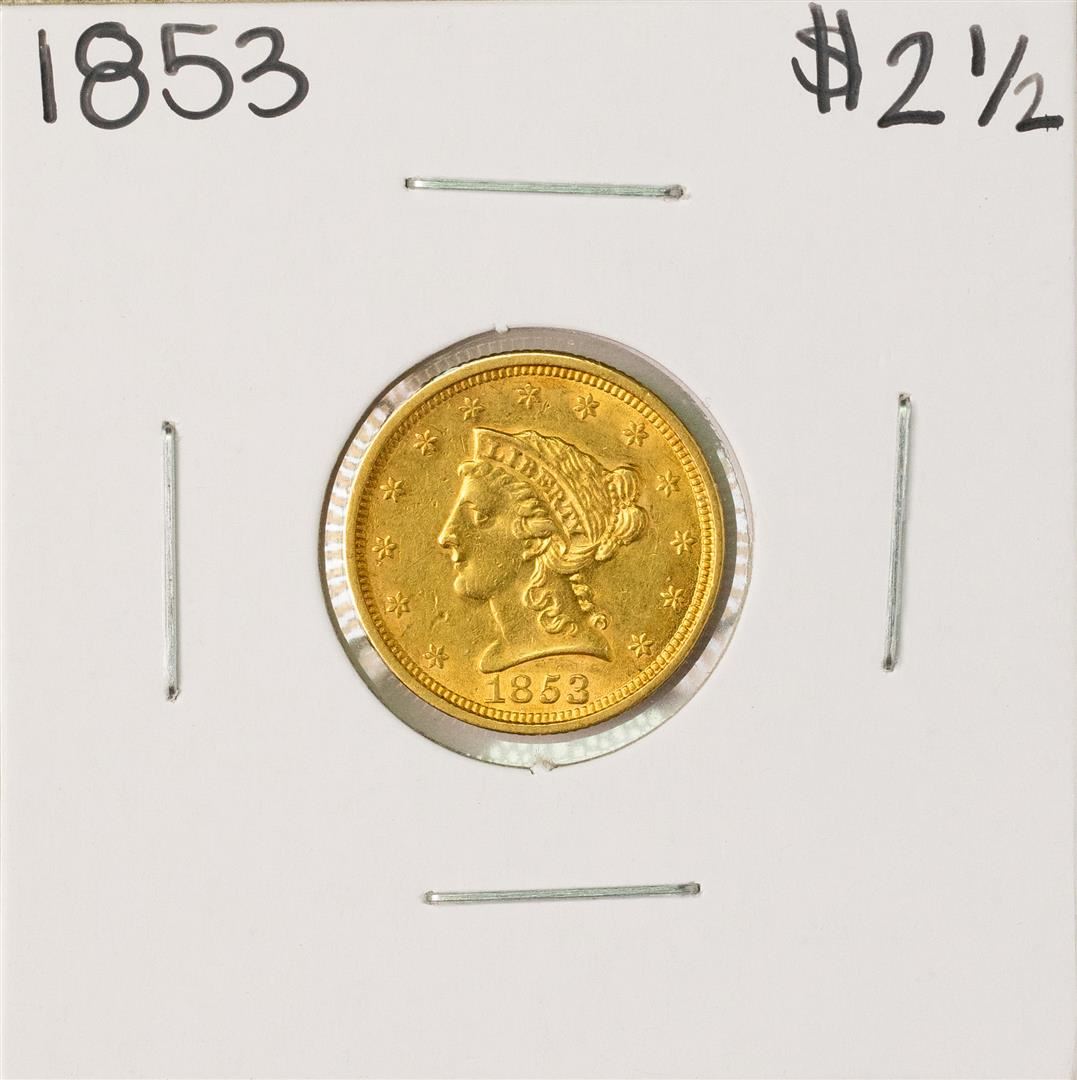 One 1853 $2 1/2 Liberty Head Quarter Eagle Gold Coin.