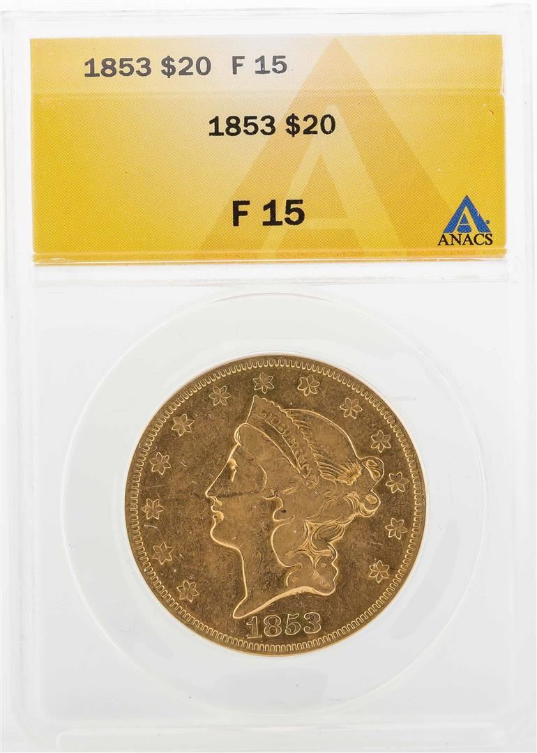 One 1853 $20 Liberty Head Double Eagle Gold Coin ANACS F15. ANACS Certified.