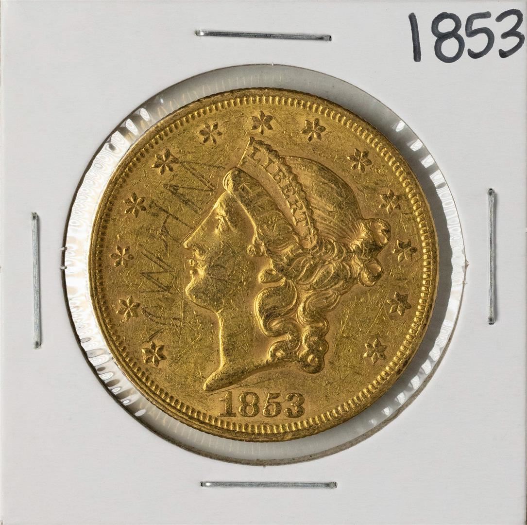 One 1853 $20 Liberty Head Double Eagle Gold Coin.