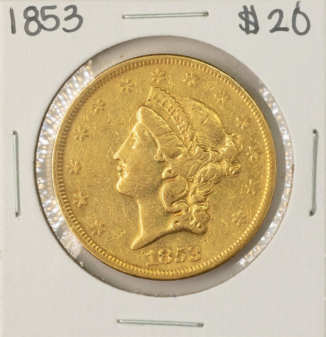 One 1853 $20 Liberty Head Double Eagle Gold Coin.