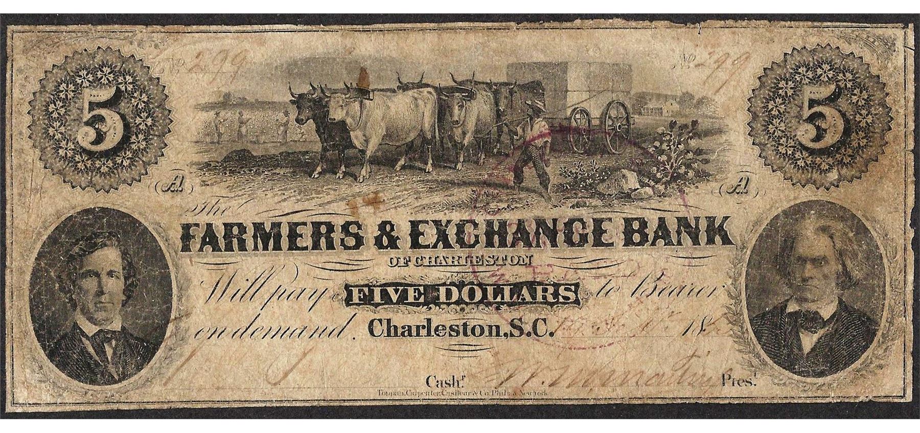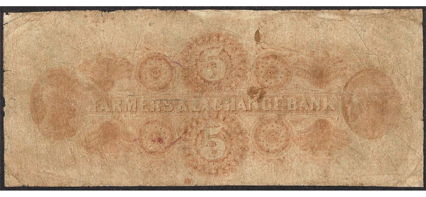 One 1853 $5 Farmers & Exchange Bank Charleston, SC Obsolete Note.
