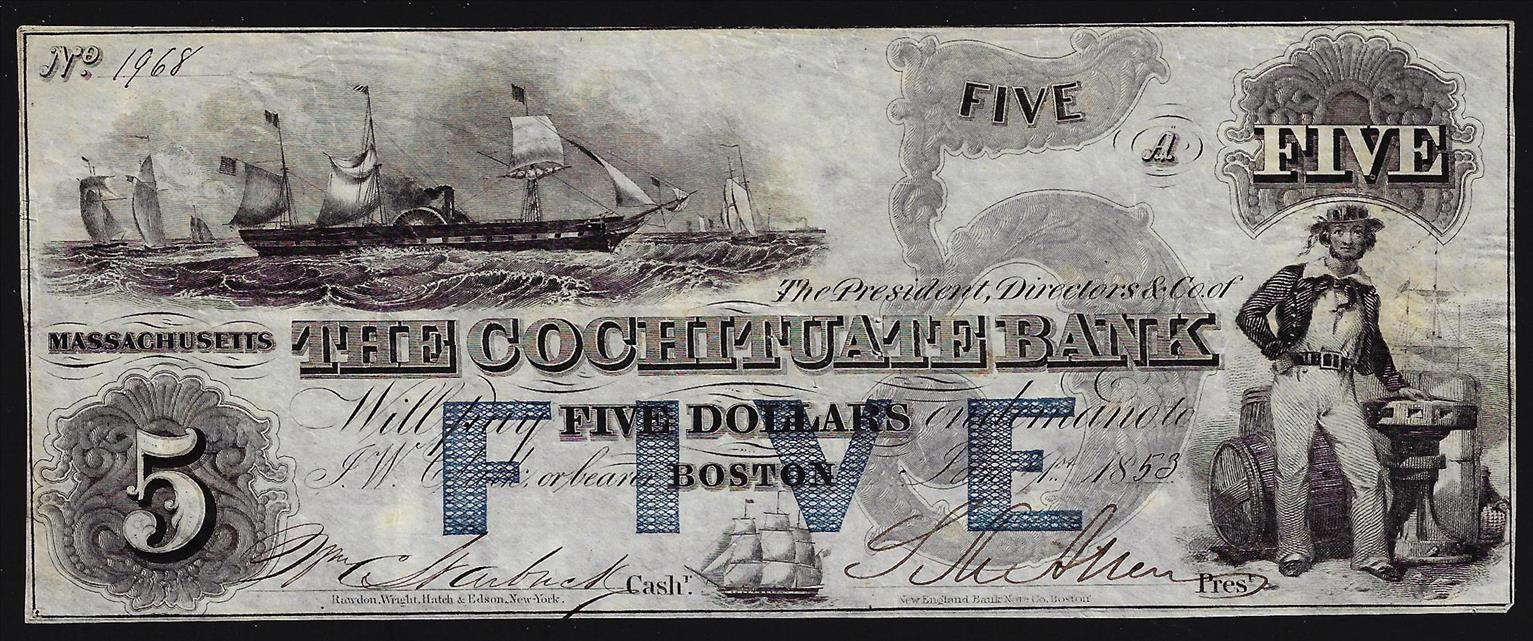 One 1853 $5 The Cochituate Bank Massachusetts Obsolete Note.