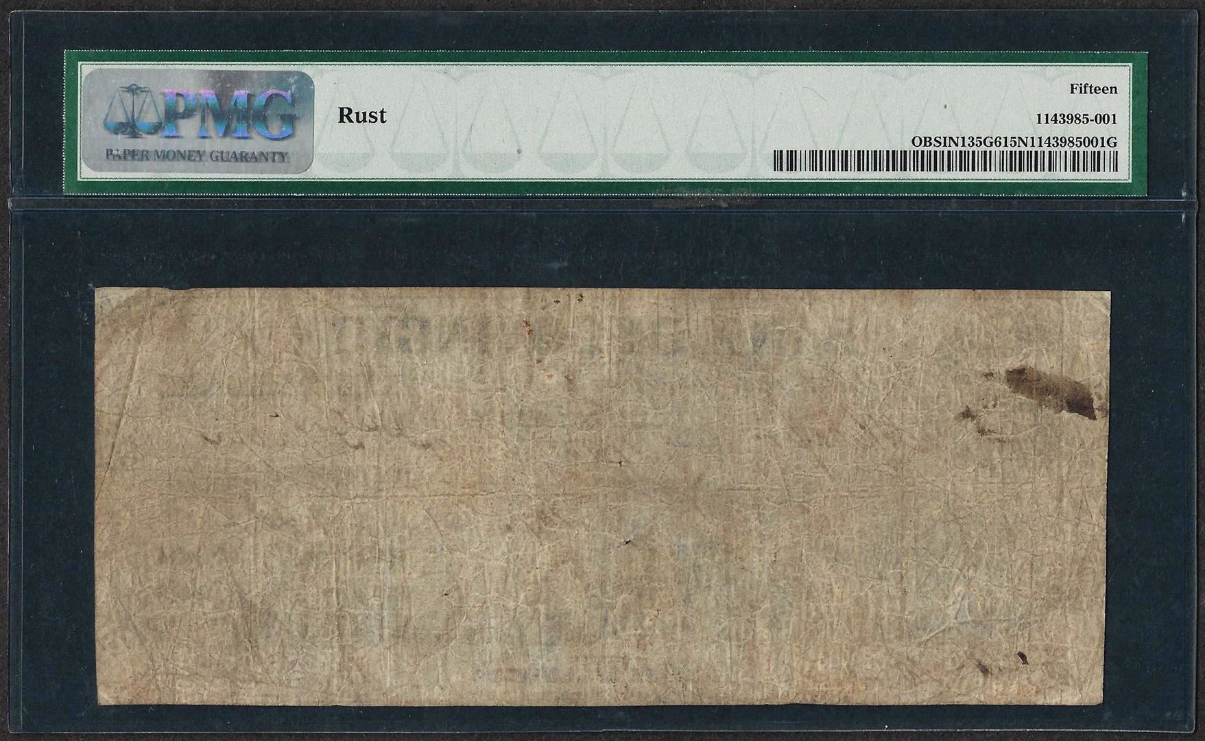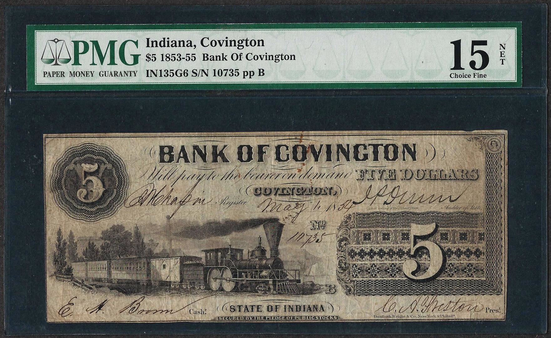 One 1853-55 $5 Bank of Covington, Indiana Obsolete Note PMG Choice Fine 15 Net. PMG Certified.