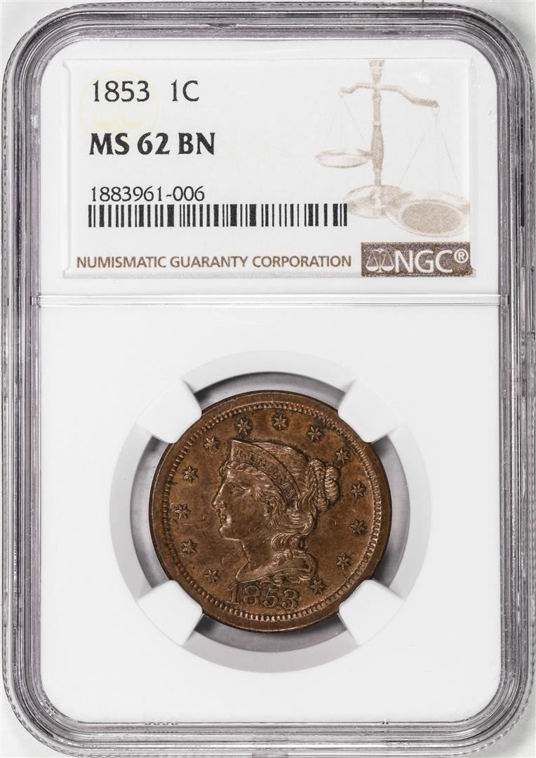 One 1853 Coronet Head Large Cent Coin NGC MS62BN. NGC Certified.