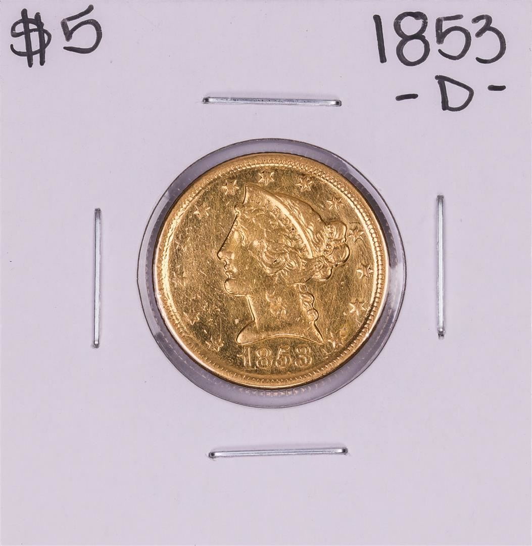One 1853-D $5 Liberty Head Half Eagle Gold Coin.