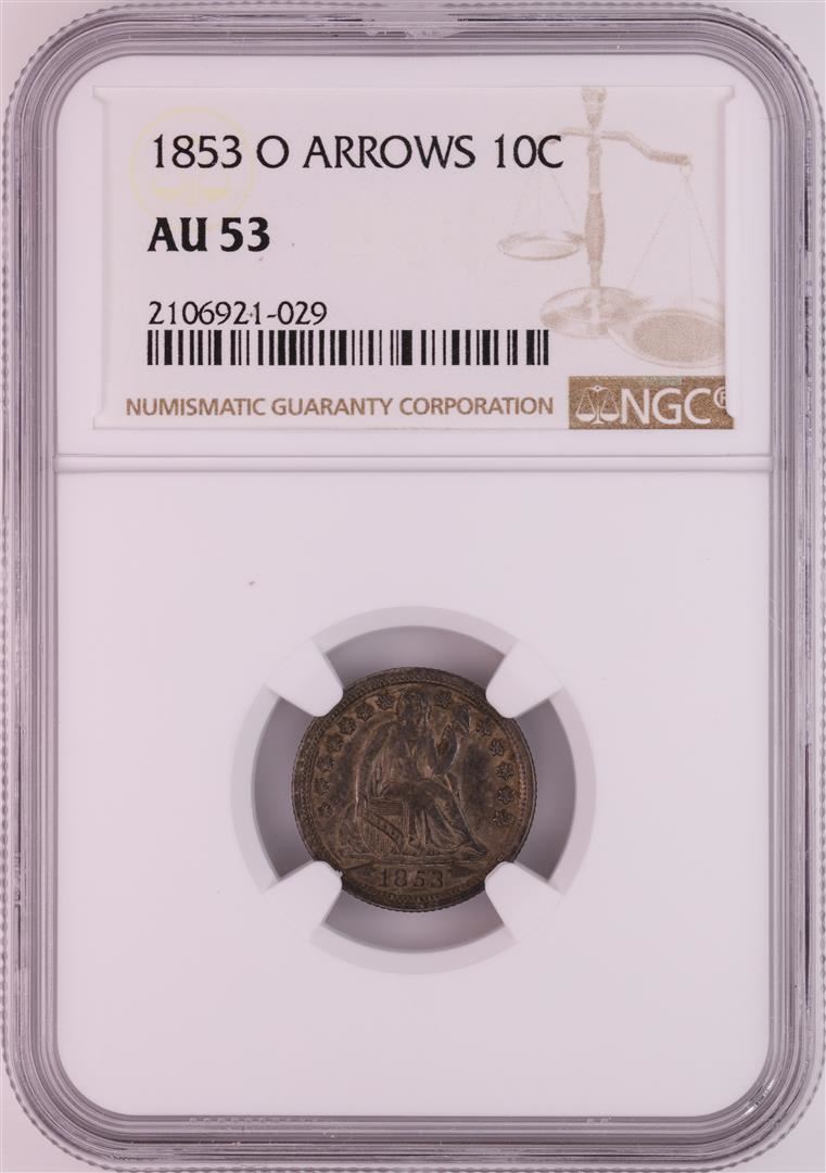 One 1853-O Arrows Seated Liberty Half Dime Coin NGC AU53. NGC Certified.