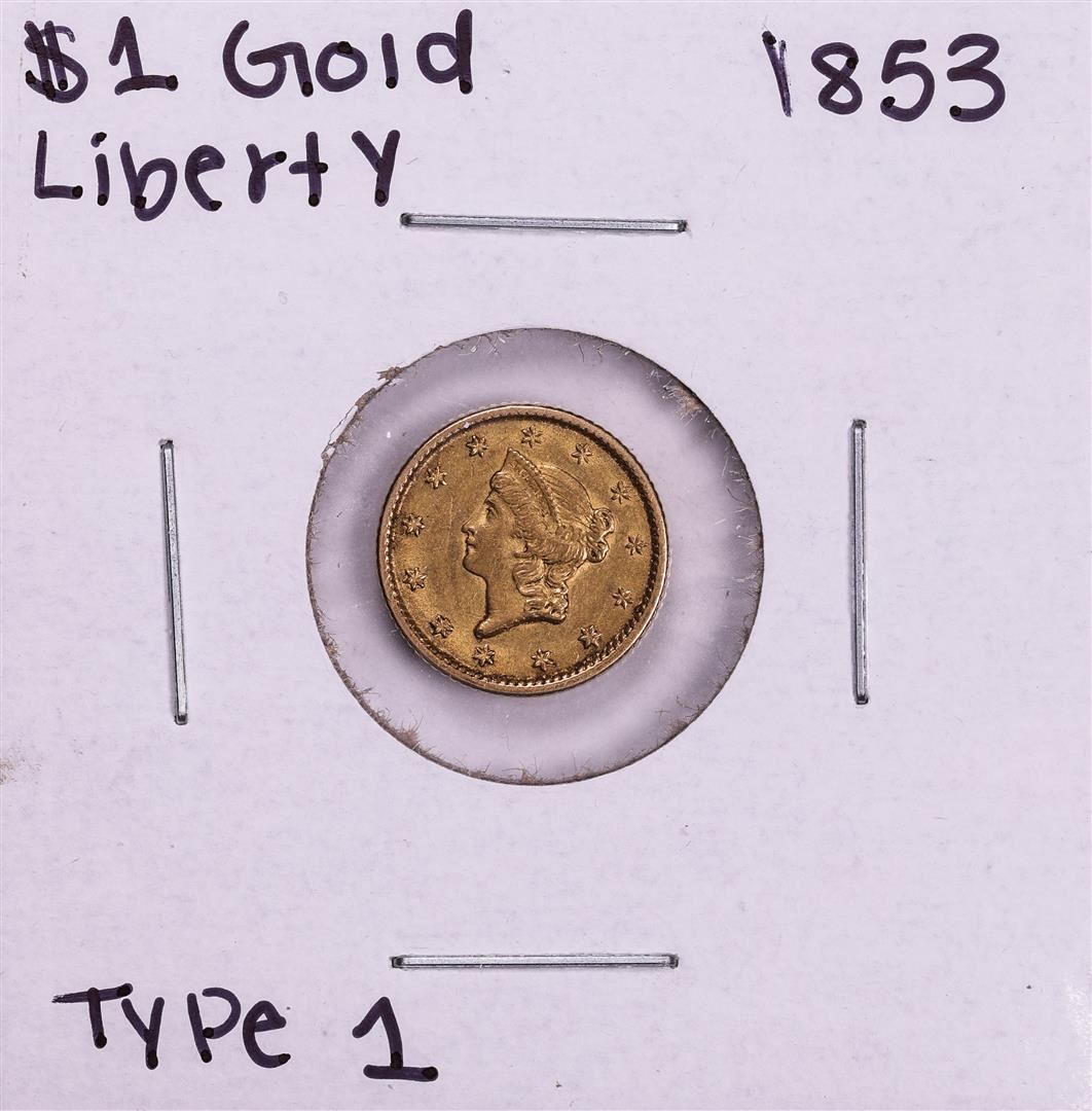 One 1853 Type 1 $1 Liberty Head Gold Dollar Coin.