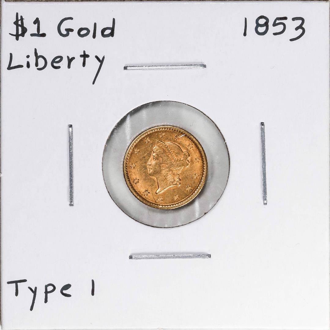 One 1853 Type 1 $1 Liberty Head Gold Dollar Coin.
