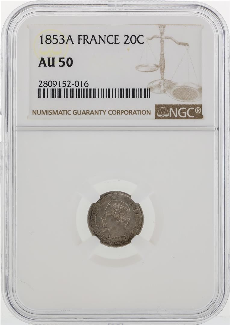 One 1853A France 20 Cent Coin NGC AU50. NGC Certified.