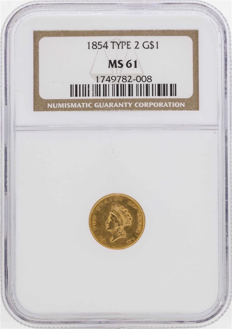 One 1854 $1 Indian Princess Head Gold Dollar Coin Type 2 NGC MS61. NGC Certified.