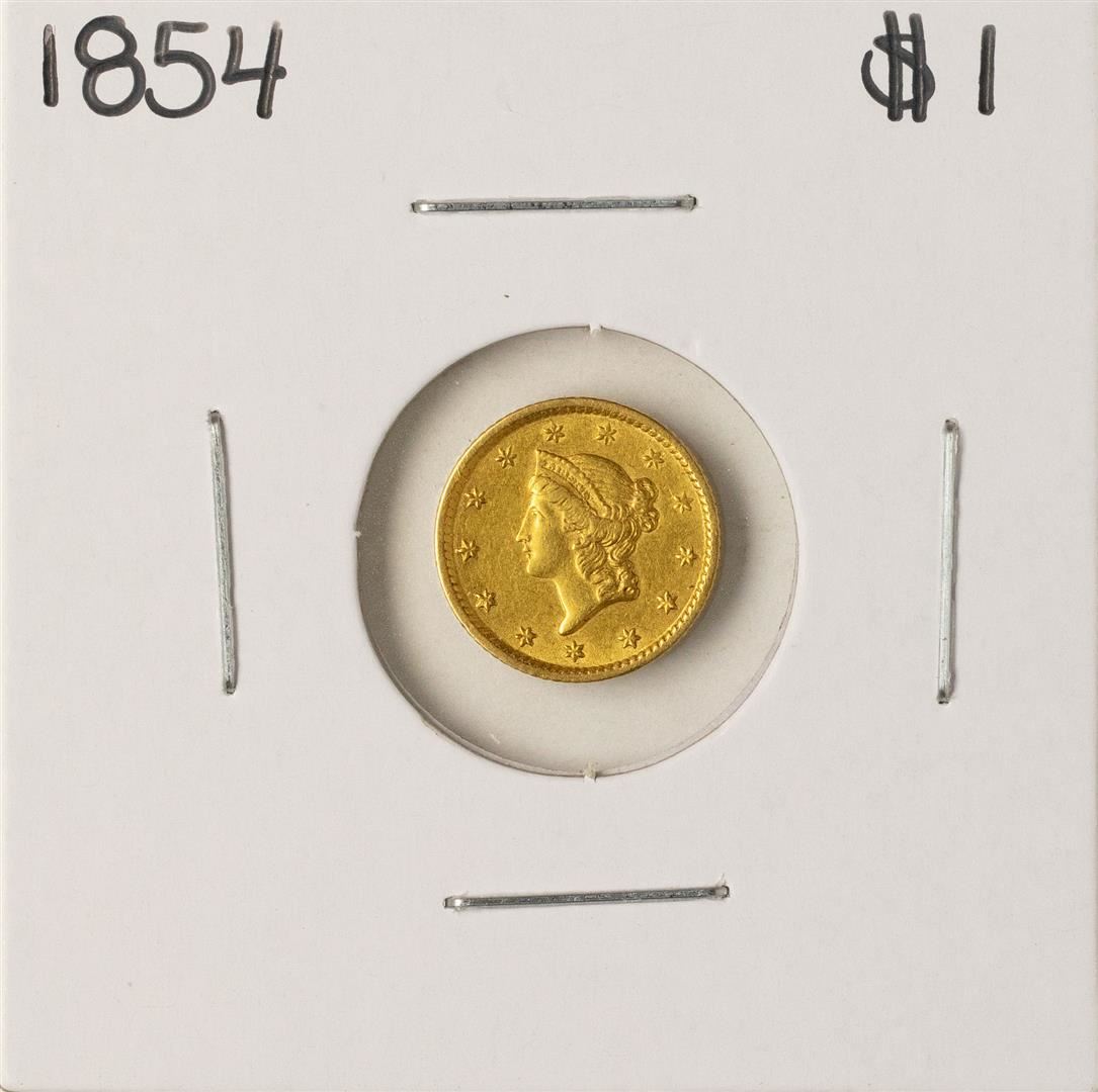 One 1854 $1 Liberty Head Gold Dollar Coin.