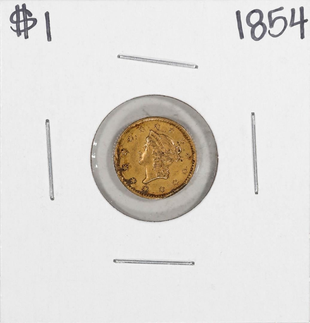 One 1854 $1 Liberty Head Gold Dollar Coin.
