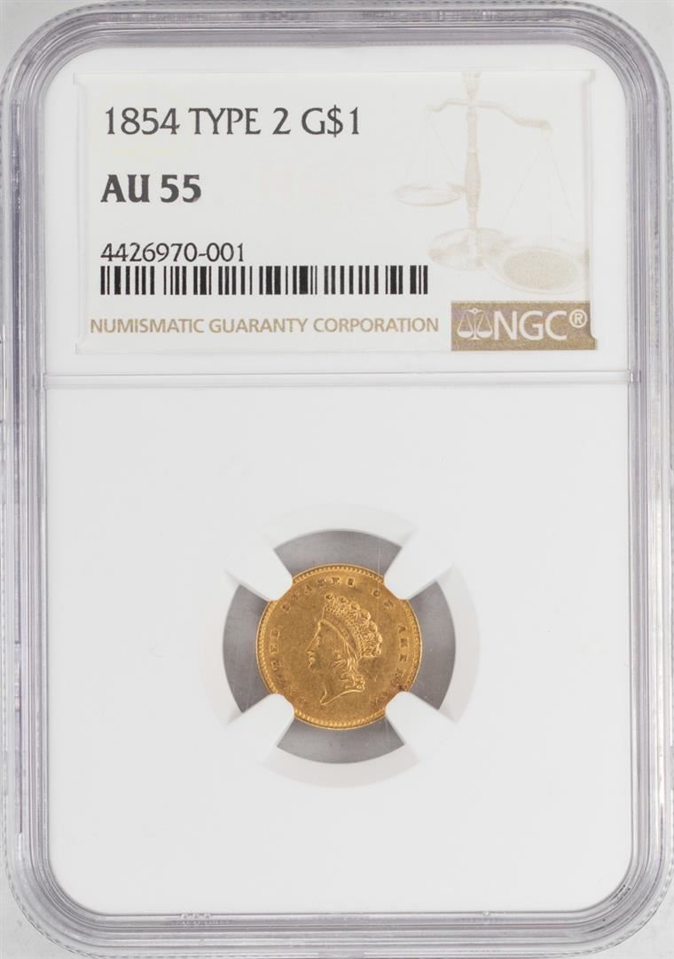 One 1854 $1 Type 2 Liberty Head Gold Dollar Coin NGC AU55. NGC Certified.