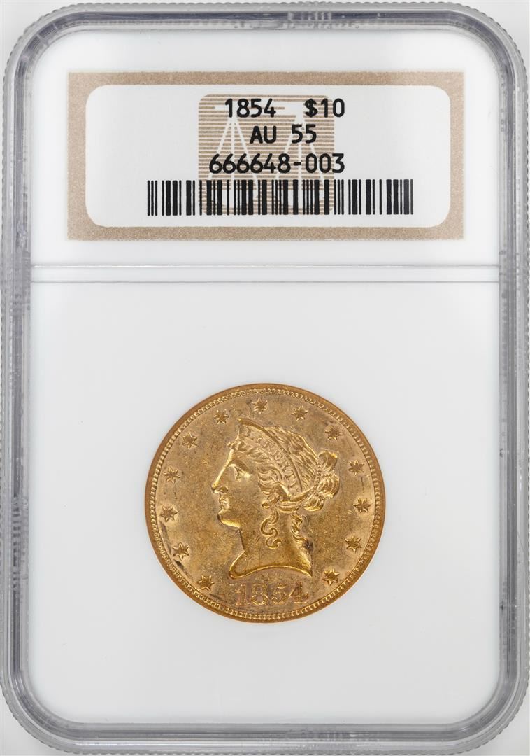 One 1854 $10 Liberty Head Half Eagle Gold Coin NGC AU55. NGC Certified.