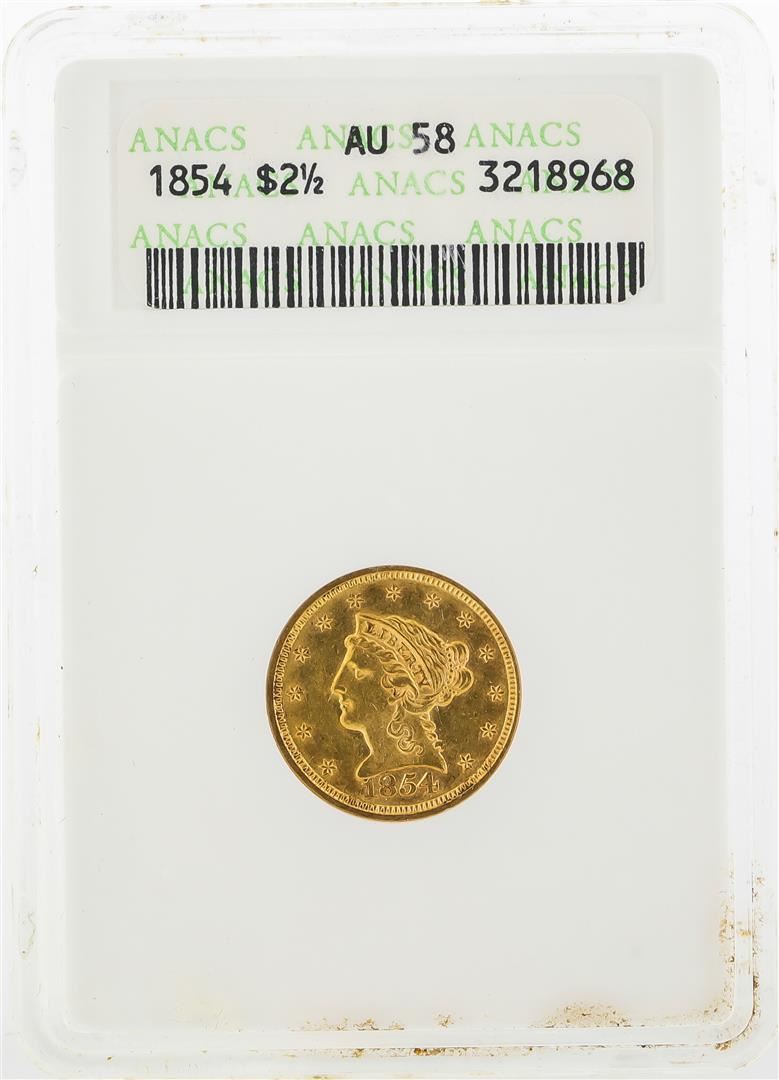 One 1854 $2 1/2 Liberty Head Quarter Eagle Gold Coin ANACS AU58. ANACS Certified.