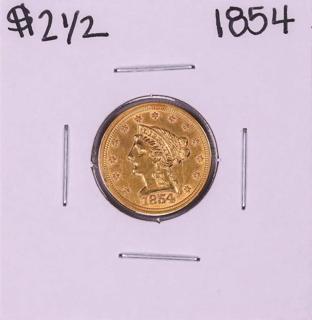 One 1854 $2 1/2 Liberty Head Quarter Eagle Gold Coin.
