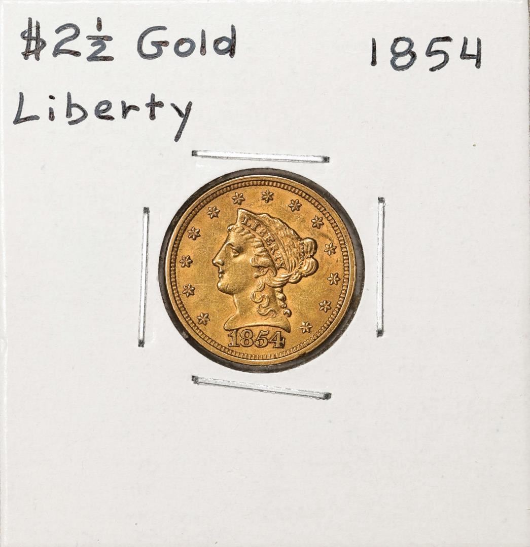 One 1854 $2 1/2 Liberty Head Quarter Eagle Gold Coin.