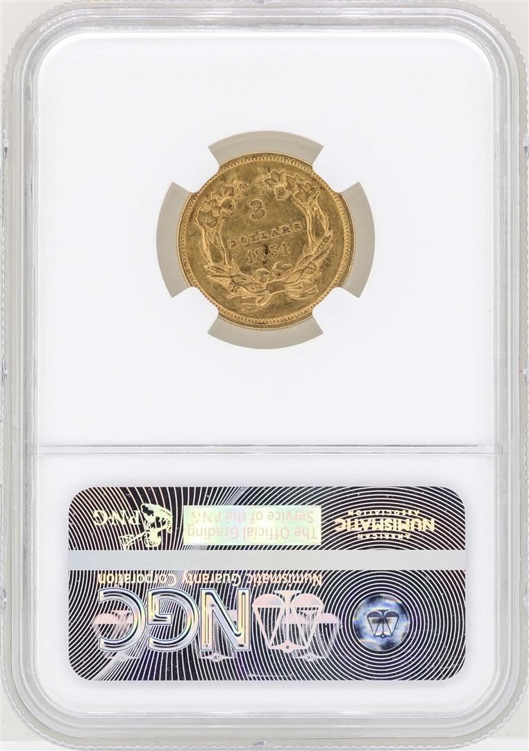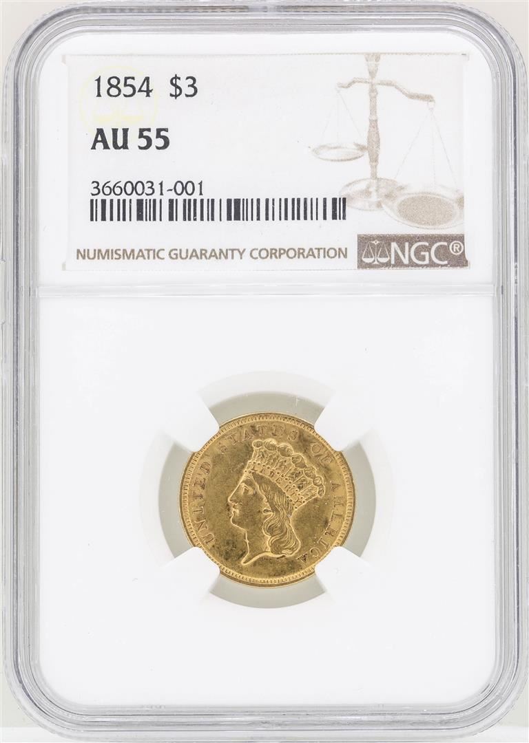 One 1854 $3 Indian Princess Head Gold Coin NGC AU55. NGC Certified.