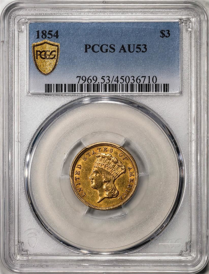 One 1854 $3 Indian Princess Head Gold Coin PCGS AU53. PCGS Graded.