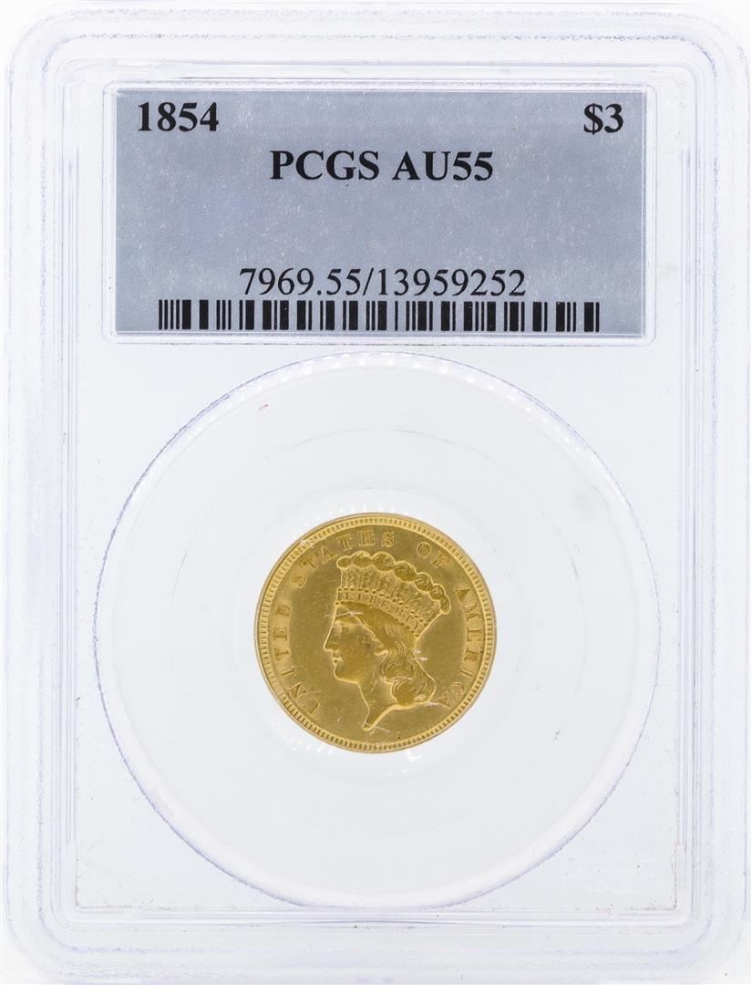 One 1854 $3 Indian Princess Head Gold Coin PCGS AU55. PCGS Graded.