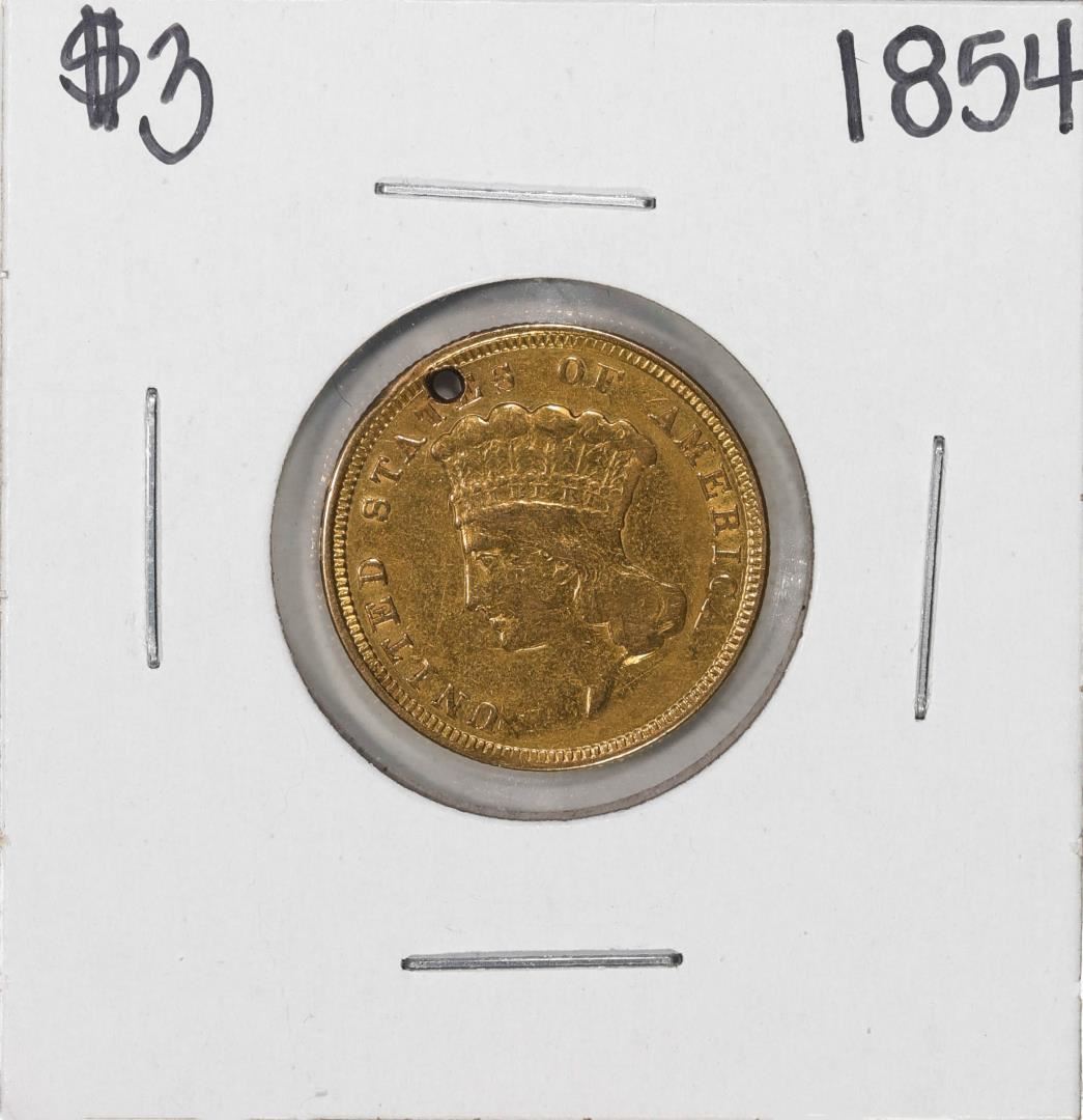One 1854 $3 Indian Princess Head Gold Coin - with Hole.