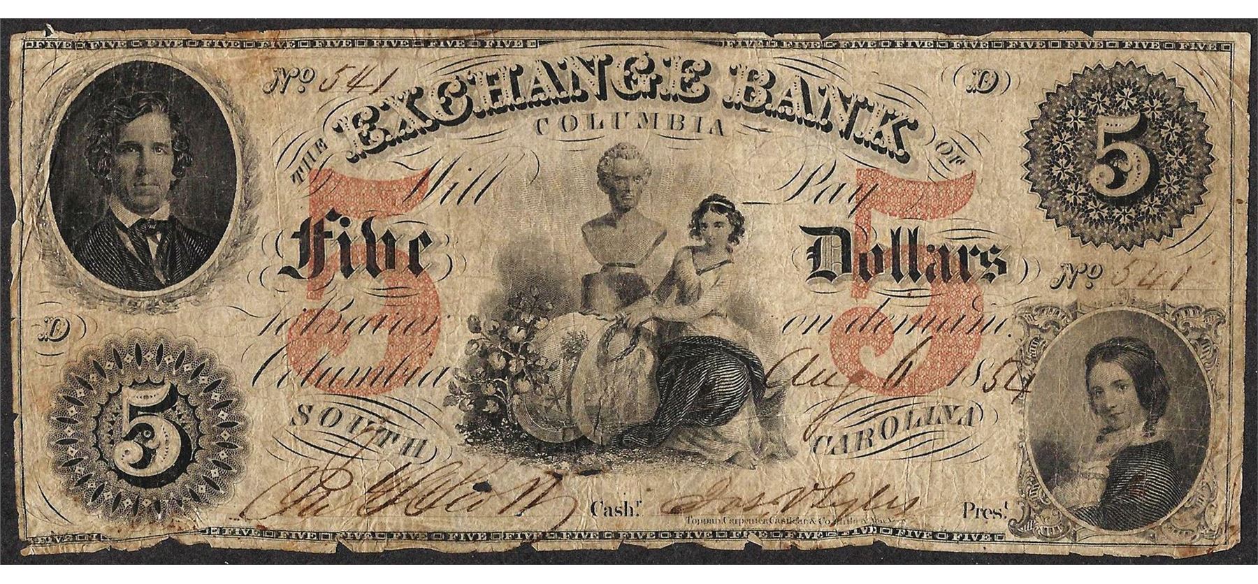 One 1854 $5 Exchange Bank of Columbia, SC Obsolete Note.