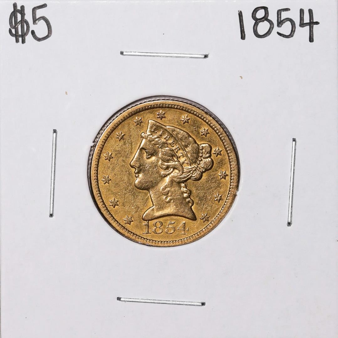 One 1854 $5 Liberty Head Half Eagle Gold Coin.