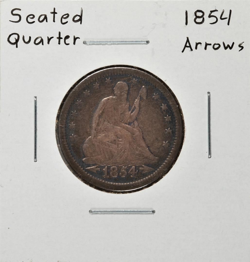 One 1854 Arrows Seated Liberty Quarter Coin.