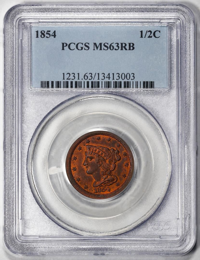 One 1854 Braided Hair Half Cent Coin PCGS MS63RB. PCGS Graded.