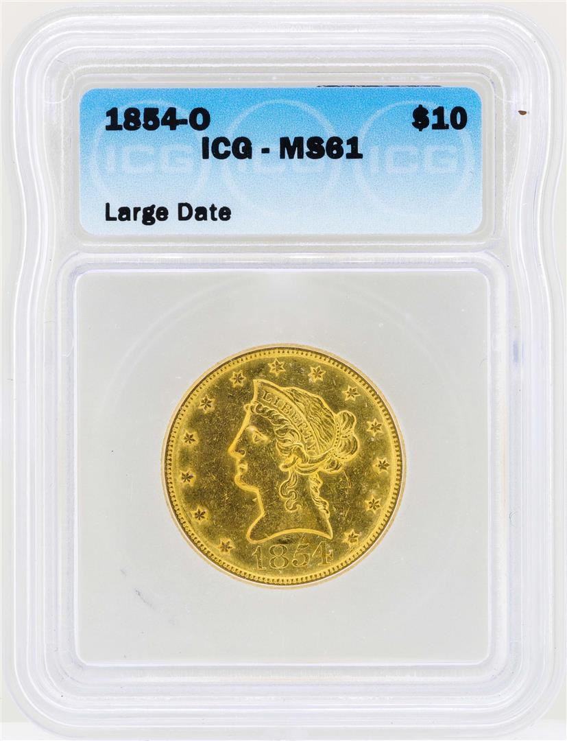 One 1854-O $10 Large Date Liberty Head Eagle Gold Coin ICG MS61. ICG Certified.