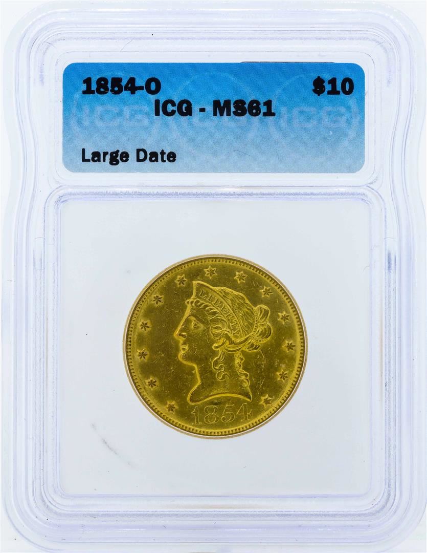One 1854-O Large Date Liberty Head Eagle Gold Coin ICG MS61. ICG Certified.