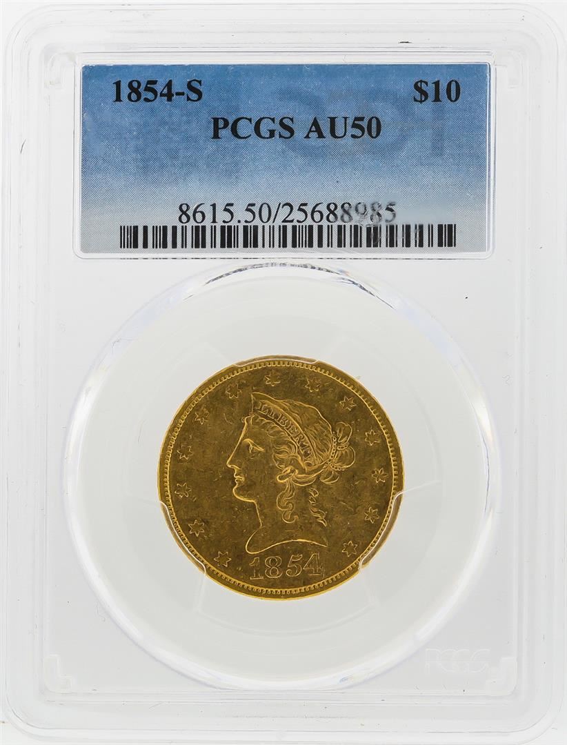 One 1854-S $10 Liberty Head Eagle Gold Coin PCGS AU50. PCGS Graded.