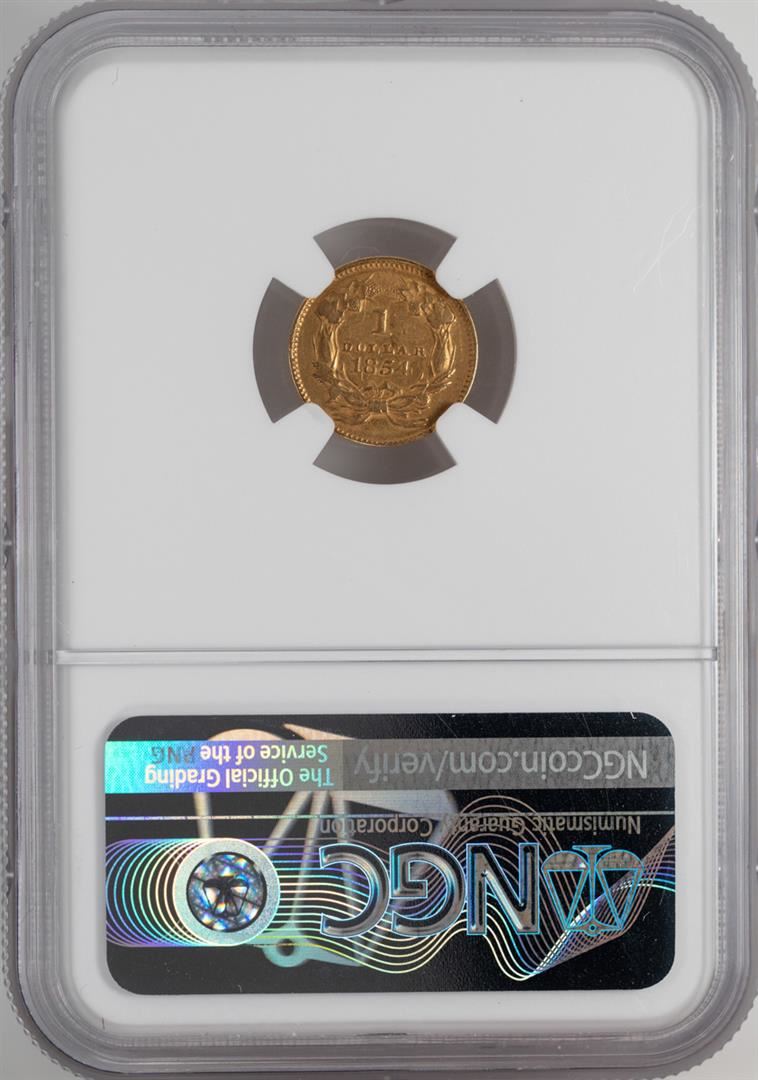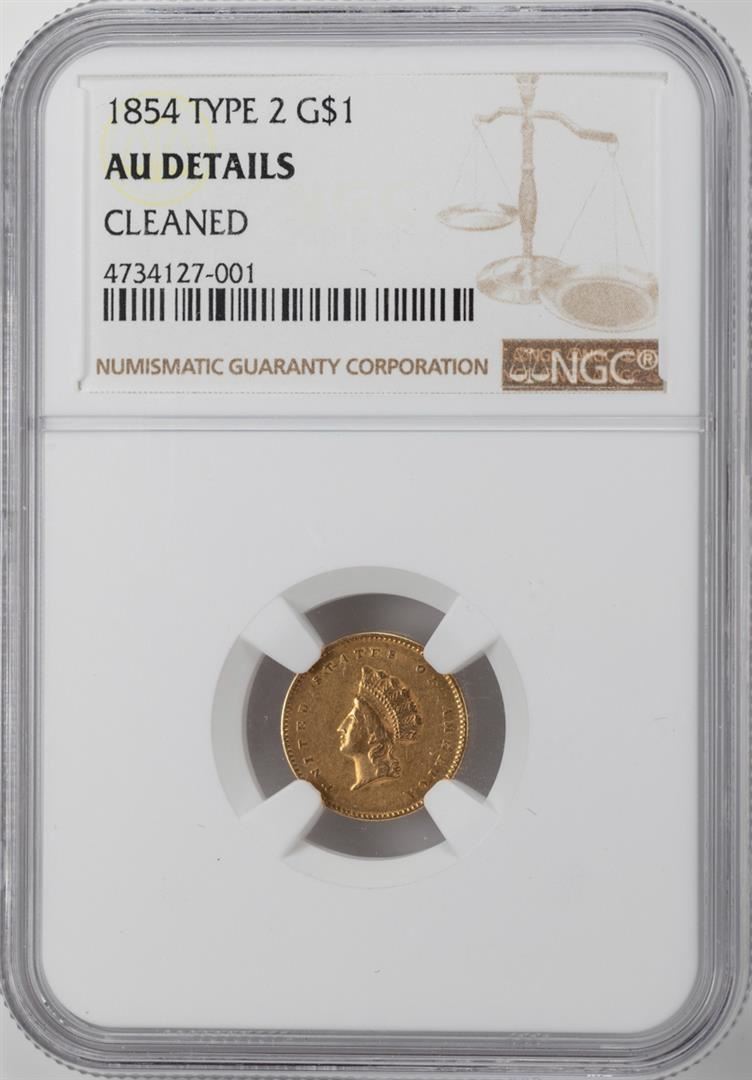 One 1854 Type 2 $1 Indian Princess Head Gold Dollar Coin NGC AU Details. NGC Certified.