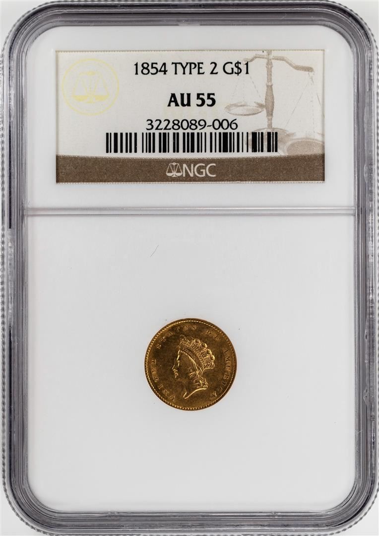 1854 Type 2 $1 Indian Princess Head Gold Dollar Coin NGC AU55