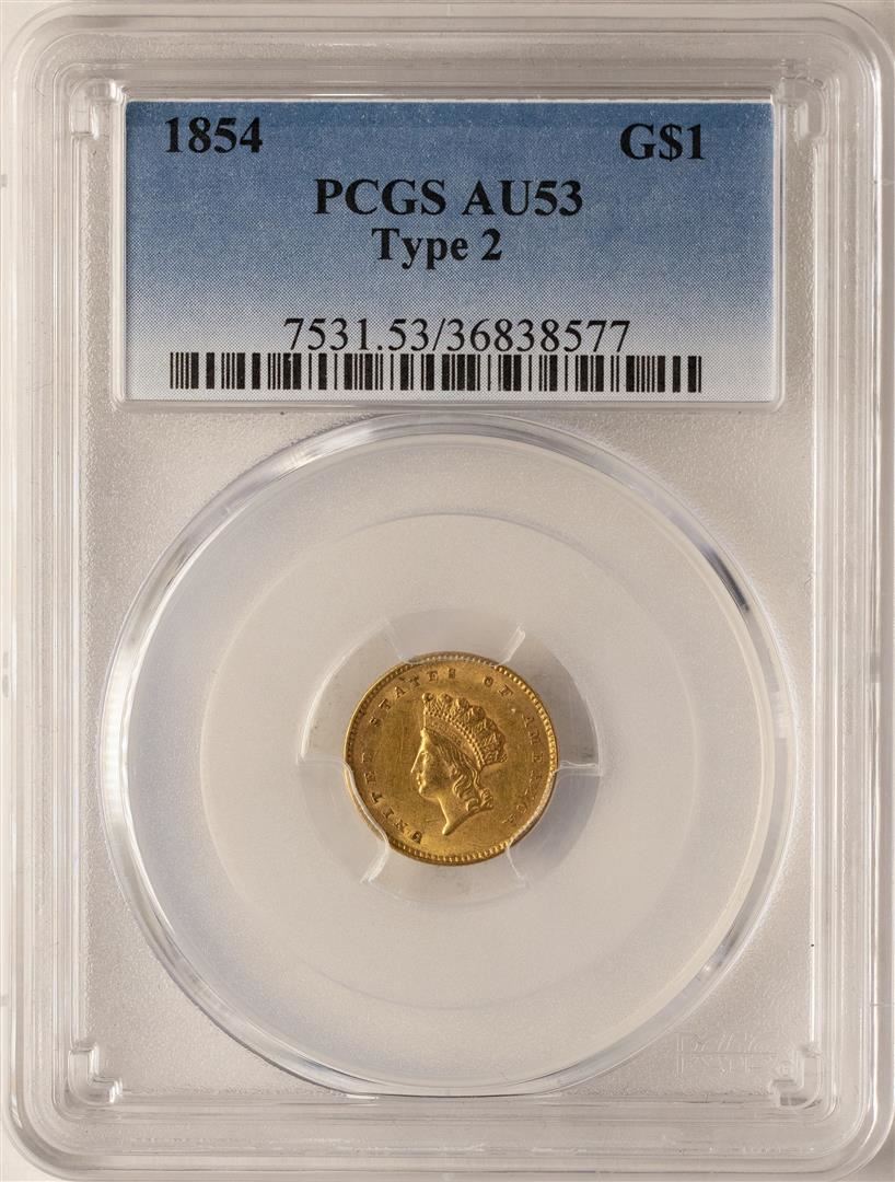 1854 Type 2 $1 Indian Princess Head Gold Dollar Coin NGC PCGS AU53