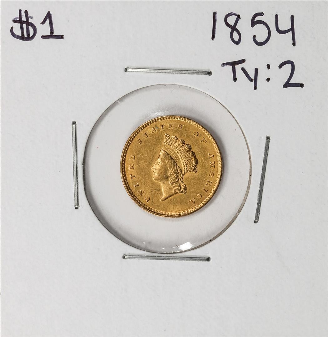 One 1854 Type 2 $1 Indian Princess Head Gold Dollar Coin - Scratched Reverse.