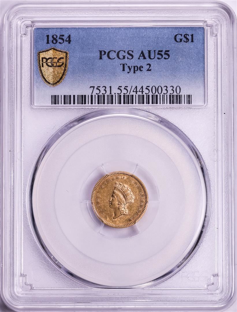 One 1854 Type 2 Indian Princess Head Gold Dollar Coin PCGS AU55. PCGS Graded.