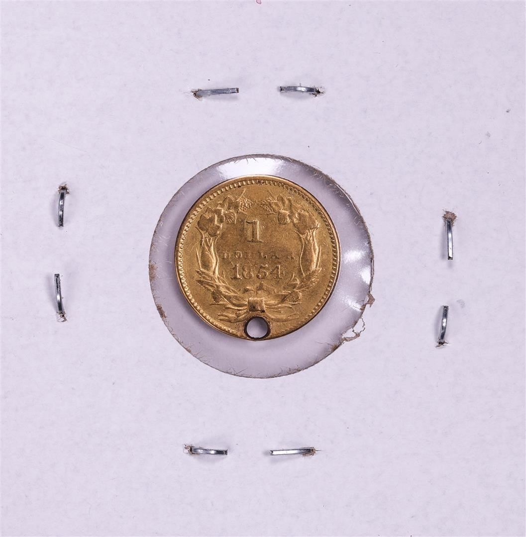 One 1854 Type 2 Indian Princess Head Gold Dollar Coin w/ Hole.