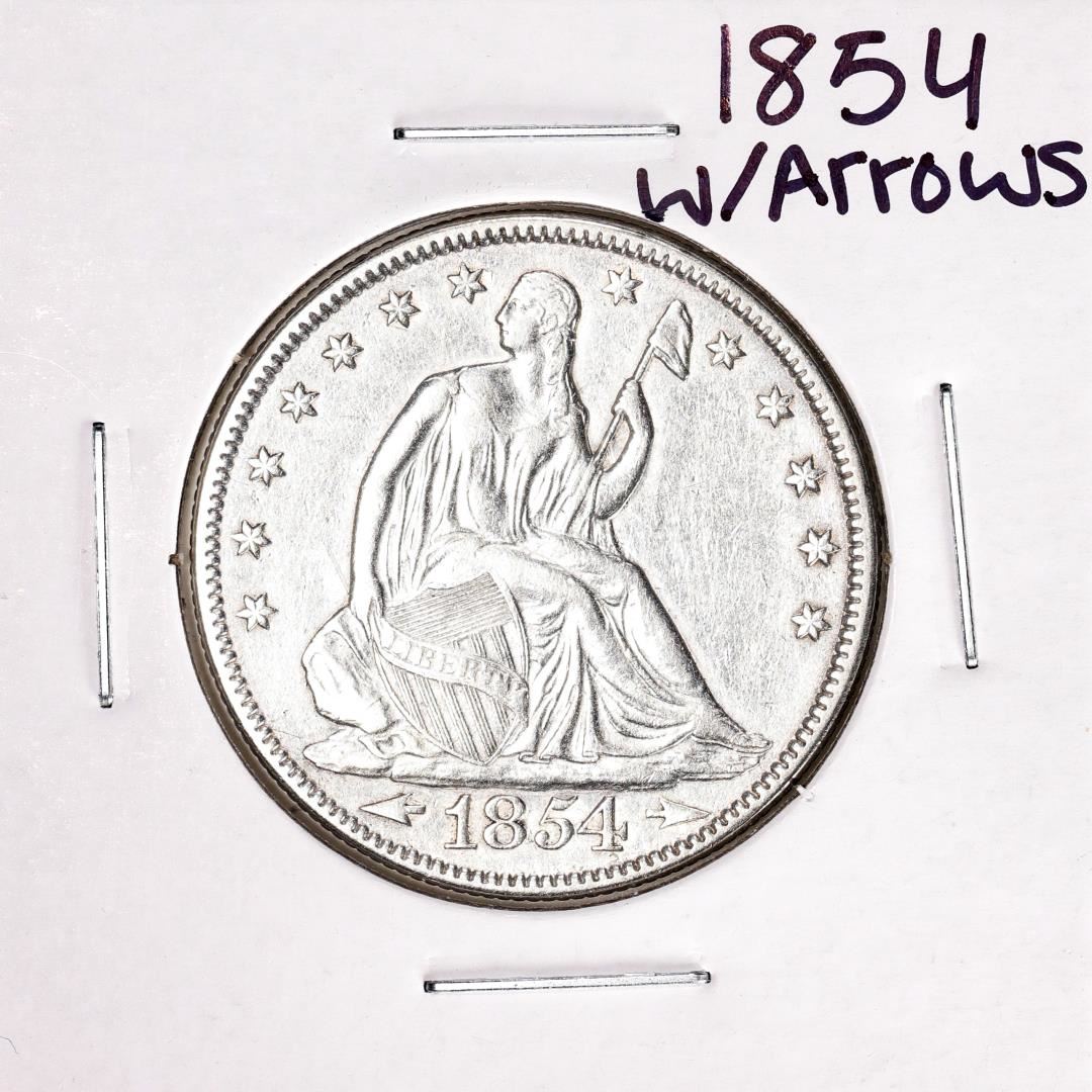 One 1854 w/Arrows Seated Liberty Half Dollar Coin.