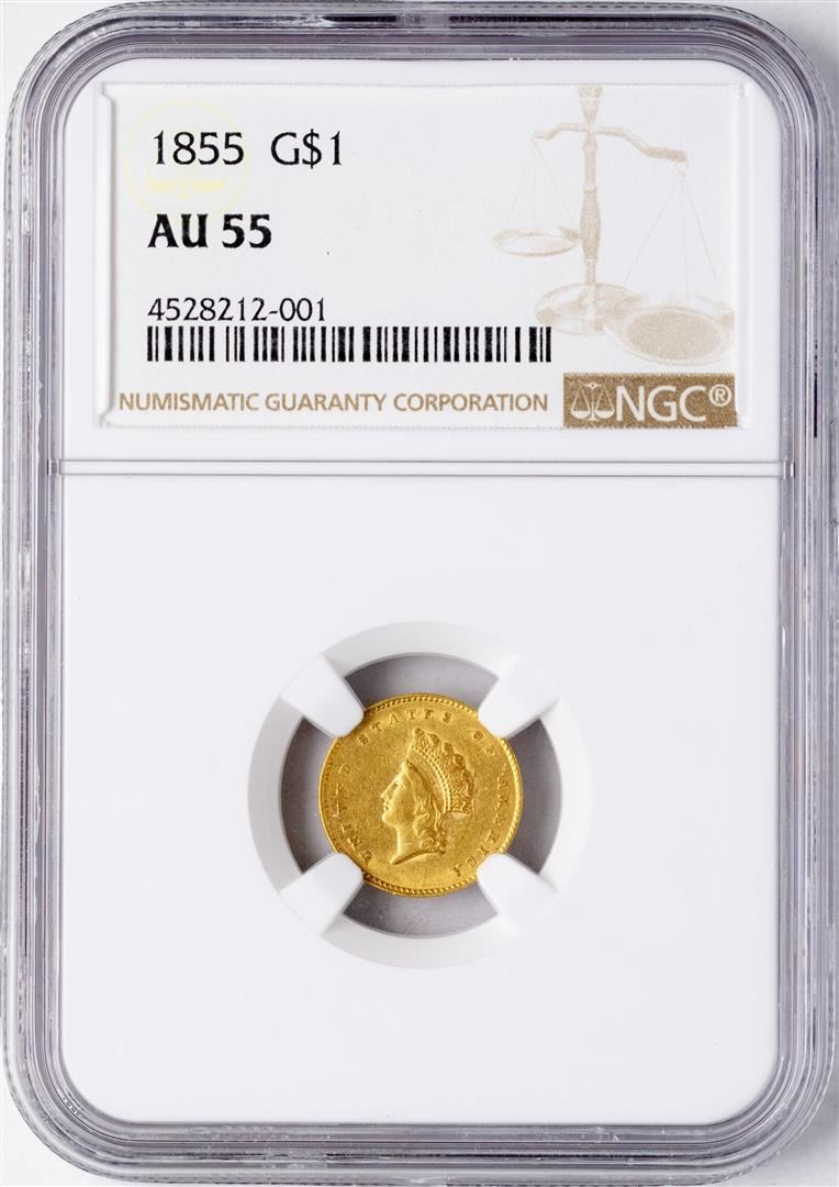One 1855 $1 Indian Princess Head Gold Dollar Coin NGC AU55. NGC Certified.