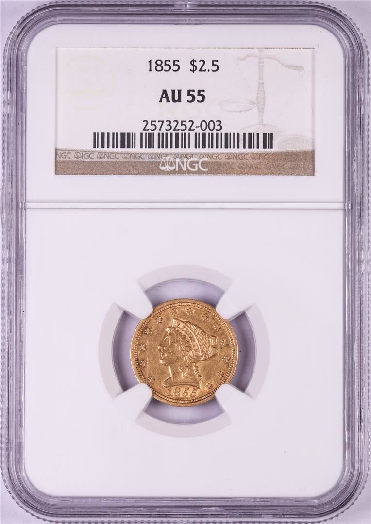 One 1855 $2 1/2 Liberty Head Quarter Eagle Gold Coin PCGS AU55. PCGS Graded.