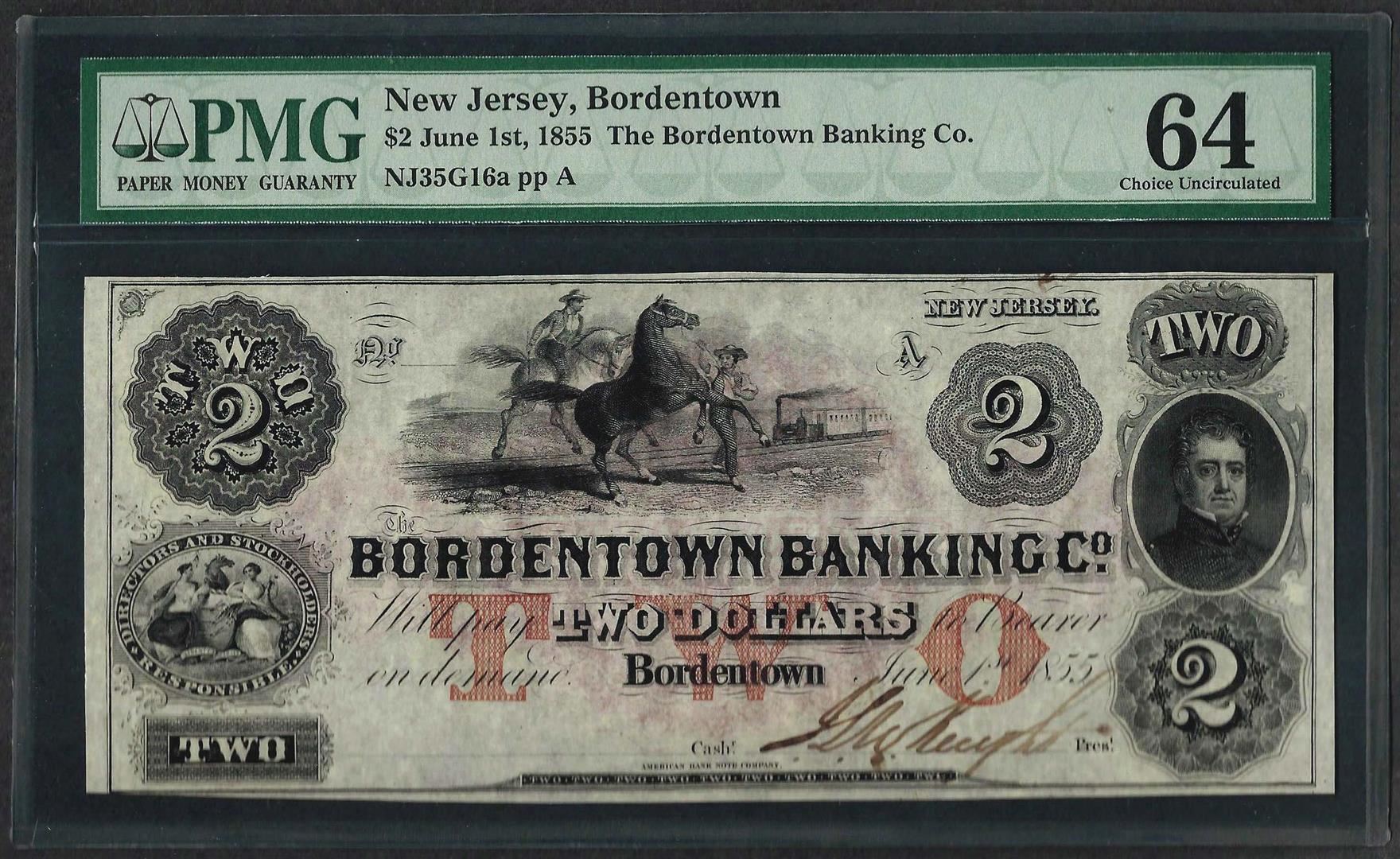 One 1855 $2 The Bordentown Banking Co. Obsolete Note PMG Choice Uncirculated 64. PMG Certified.