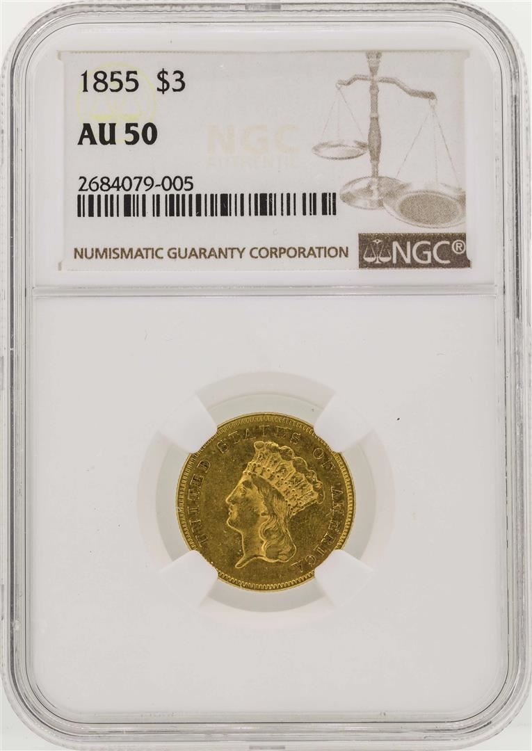 One 1855 $3 Indian Princess Head Gold Coin NGC AU50. NGC Certified.