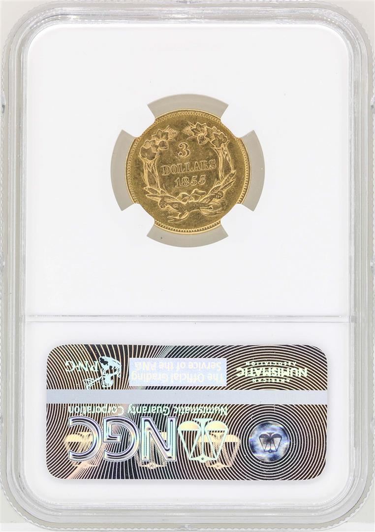 One 1855 $3 Indian Princess Head Gold Coin NGC AU53. NGC Certified.