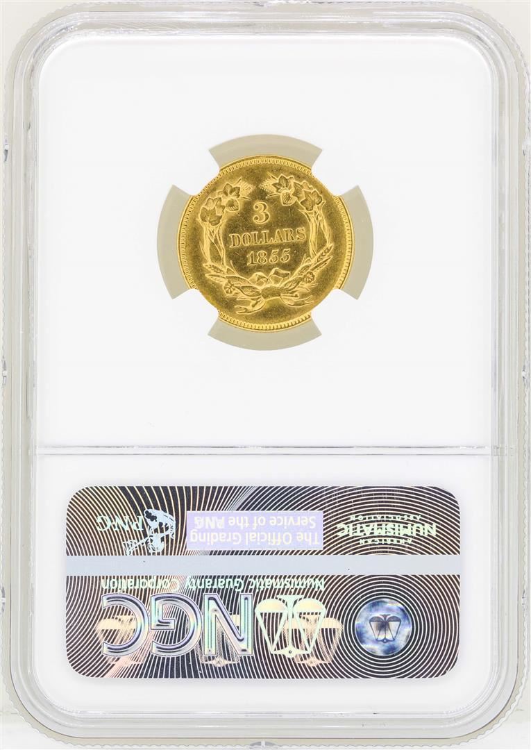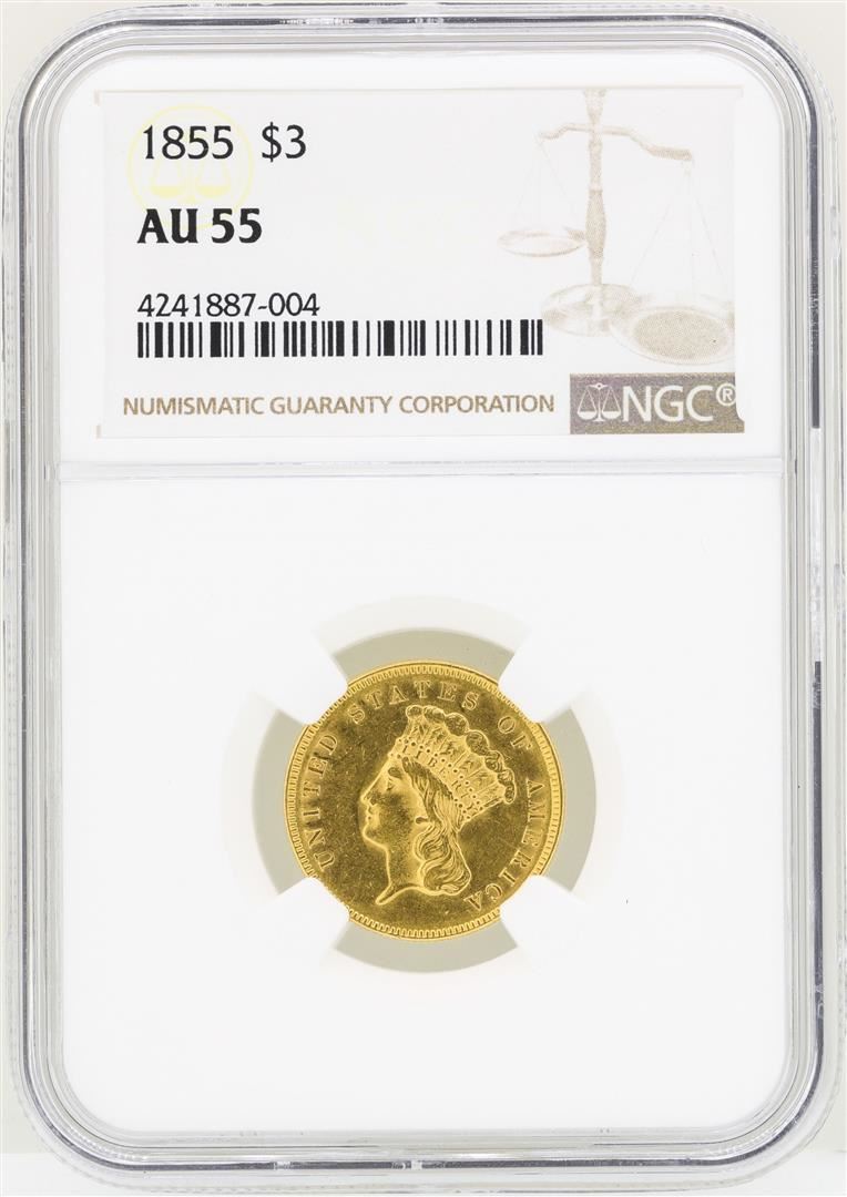 One 1855 $3 Indian Princess Head Gold Coin NGC AU55. NGC Certified.