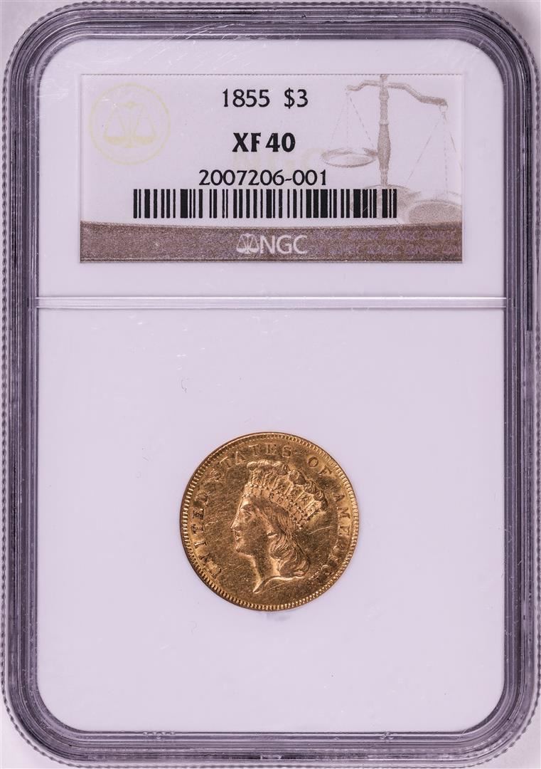 One 1855 $3 Indian Princess Head Gold Coin NGC XF40. NGC Certified.