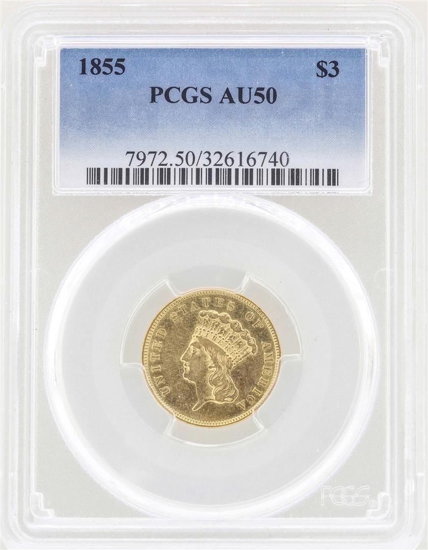 One 1855 $3 Indian Princess Head Gold Coin PCGS AU50. PCGS Graded.